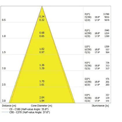 De gradenbundel geeft informatie over hoe breed het licht wordt uitgestraald. Dit zit tussen de 0 en 360 graden (D). Hoe kleiner de hoek, hoe specifieker de lichtbundel is. Over het algemeen is een smalle gradenbundel perfect voor sfeer- of accentverlichting, terwijl een brede gradenbundel ideaal is om grote oppervlaktes te verlichten.