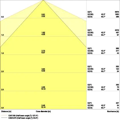 De gradenbundel geeft informatie over hoe breed het licht wordt uitgestraald. Dit zit tussen de 0 en 360 graden (D). Hoe kleiner de hoek, hoe specifieker de lichtbundel is. Over het algemeen is een smalle gradenbundel perfect voor sfeer- of accentverlichting, terwijl een brede gradenbundel ideaal is om grote oppervlaktes te verlichten.